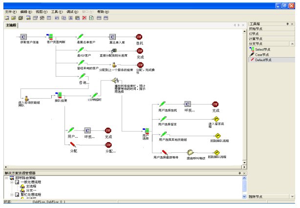 Hi-Link提供圖形化、流程式的ACD路由策略定制工具,實現(xiàn)ACD流程的靈活定義和配置。該工具不僅僅實現(xiàn)了流程邏輯、資源管理和數(shù)據(jù)庫訪問的可配置,而且可以在流程中內(nèi)嵌VBScript處理邏輯,進而實現(xiàn)更加強大的路由管理能力。如圖所示: