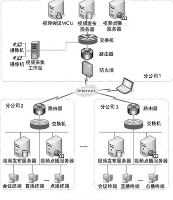 旺城國(guó)際控股集團(tuán)視頻會(huì)議系統(tǒng),其Internet出口帶寬為10M,因?yàn)樵摮隹谶要傳輸各種業(yè)務(wù)數(shù)據(jù),所以實(shí)際用于視頻會(huì)議的帶寬大概在5M左右,各分公司的接入速率在384Kbps~768Kbps之間。方案采用一臺(tái)高性能服務(wù)器作為MCU,以確保支持五會(huì)場(chǎng)的遠(yuǎn)程接入。同時(shí),在五個(gè)分公司配置一臺(tái)直播服務(wù)器,支持各地Intranet(均為100M帶寬)內(nèi)的電腦用戶接收會(huì)議現(xiàn)場(chǎng)組播,并錄制、上傳到點(diǎn)播服務(wù)器備份以供會(huì)后研討。整個(gè)視頻會(huì)議的包括: