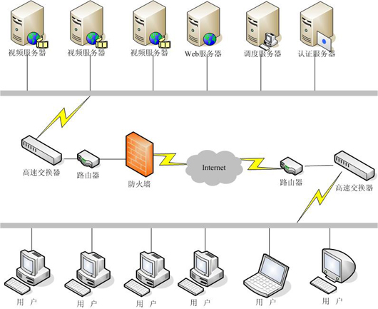 考慮到在線點播的用戶為1000并發(fā),所以使用一臺服務器就可以滿足需求了,客戶可以通過認證后,經(jīng)客戶經(jīng)過調(diào)度服務器將請求反饋給視頻服務器,完成視頻點播流程,具體架構如圖。