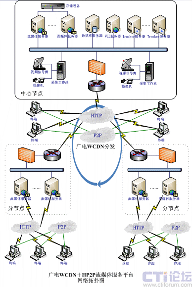 根據(jù)以上情況,廣電系統(tǒng)的流媒體服務平臺采用VIEWGOOD流媒體服務平臺,利用HP2P、WCDN技術(shù)進行分級部署;以下給出網(wǎng)絡(luò)拓撲圖: