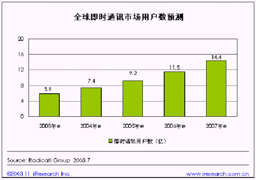 年即時(shí)通訊將成為互聯(lián)網(wǎng)上最普及的交流方式。隨著即時(shí)通訊的普及,全球即時(shí)通訊用戶規(guī)模也在不斷擴(kuò)大。即時(shí)通訊市場龐大的用戶規(guī)模和增長潛力早已引起了業(yè)內(nèi)巨頭的激烈競爭。以美國為例,目前,AOL、MSN