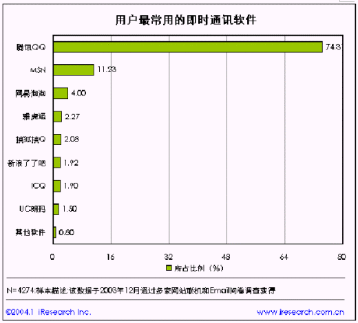 根據(jù)不完全統(tǒng)計(jì),2003 年中國即時(shí)通訊軟件的最高在線人數(shù)已經(jīng)突破了550 萬人。其中,QQ、MSN Messenger、網(wǎng)易泡泡、UC 朗瑪這四個(gè)即時(shí)通訊軟件占據(jù)了市場的絕大部分份額。我們預(yù)計(jì)未來隨著中國上網(wǎng)人口的增長,以及IM