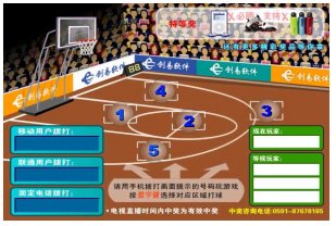 場地分成 5 個(gè)區(qū)域,分別對(duì)應(yīng) 1 - 5 ,想在哪個(gè)區(qū)域投籃就按電話機(jī)上對(duì)應(yīng)的 1-5 號(hào)鍵或直接在手機(jī)上寫短信區(qū)域號(hào)( 1-5 )發(fā)送到短信號(hào)碼,即可完成一次進(jìn)攻,投中后即可可獲得獎(jiǎng)品。本游戲由電視臺(tái)、網(wǎng)站與電信運(yùn)營商聯(lián)合經(jīng)營的電信增值業(yè)務(wù),由電視臺(tái)提供頻道向電視觀眾播出游戲畫面(含圖像和聲音),電信運(yùn)營商提供電話線路和短信通道,參與者通過固定電話、小靈通和手機(jī)參與游戲,運(yùn)營方通過收取固定電話、小靈通和手機(jī)的信息費(fèi)實(shí)現(xiàn)盈利。