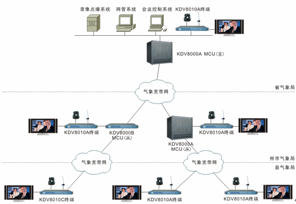 二期工程將實(shí)現(xiàn)州市到縣的建設(shè)。屆時(shí),州市氣象局既是省氣象局的遠(yuǎn)端節(jié)點(diǎn)又是縣氣象局的中心點(diǎn),可根據(jù)情況部署KDV8000A或KDV8000B多點(diǎn)控制單元,向上與省氣象局多點(diǎn)控制單元級(jí)聯(lián),向下與縣氣象局視頻會(huì)議終端相連。州市氣象局在一期工程中已配視頻會(huì)議終端,因此二期工程僅需在各縣氣象局部署KDV8010A或KDV8010C視頻會(huì)議終端各1臺(tái)即可,通過氣象寬帶網(wǎng)接入州市氣象局的多點(diǎn)控制單元。