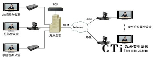 2009年6月,領(lǐng)先的視訊廠商科達(dá)攜TrueSens(致勝)視頻會(huì)議系統(tǒng)走進(jìn)海瀾,為海瀾集團(tuán)搭建了一套覆蓋總部2個(gè)領(lǐng)導(dǎo)辦公室、1個(gè)銷售會(huì)議室及全國(guó)32個(gè)分公司的視頻會(huì)議系統(tǒng)。整個(gè)方案在部署上非常便捷,海瀾江陰總部的機(jī)房架設(shè)一臺(tái)高、標(biāo)清一體化多點(diǎn)控制單元(MCU),銷售會(huì)議室、集團(tuán)王總、陶總的辦公室以及海瀾集團(tuán)在全國(guó)的32個(gè)分公司銷售會(huì)議室則各部署一套視頻會(huì)議終端?偛繋挒100M,分支機(jī)構(gòu)則均通過(guò)普通ADSL接入。系統(tǒng)拓?fù)鋱D如下: