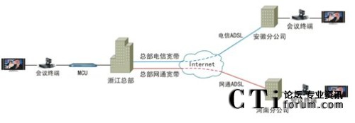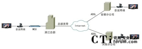 該套視頻會議系統(tǒng)最大的特點(diǎn)就是擁有超強(qiáng)的網(wǎng)絡(luò)適應(yīng)性。由于采用了高效視音頻編碼技術(shù)和大量智能化網(wǎng)絡(luò)適應(yīng)技術(shù),無論是ADSL、光纖還是VPN,均可進(jìn)行快速接入,并充分保證在Internet環(huán)境下的會議效果。因此,天元置業(yè)此次視頻會議系統(tǒng)就是完全基于公司現(xiàn)有的Internet進(jìn)行部署的。如圖1。