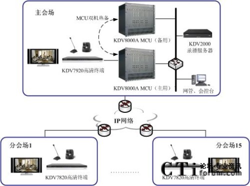 在充分了解用戶應(yīng)用需求的基礎(chǔ)上,2011年初科達(dá)為青島工商局規(guī)劃部署了一套高清視頻會(huì)議系統(tǒng)。其中,為了進(jìn)一步提升用戶的遠(yuǎn)程溝通體驗(yàn)和交互感,科達(dá)在市局主會(huì)場部署了1臺(tái)KDV7920高清視頻會(huì)議終端,在下屬14個(gè)分(市)局以及工商所分會(huì)場則各部署了1臺(tái)KDV7820高清視頻會(huì)議終端;而考慮到青島工商對(duì)于系統(tǒng)安全性、穩(wěn)定性方面的較高要求,科達(dá)則為其部署了 2臺(tái)KDV8000A多點(diǎn)控制單元(MCU)以實(shí)現(xiàn)雙機(jī)熱備;此外,系統(tǒng)還部署了KDV2000錄播服務(wù)器,以實(shí)現(xiàn)會(huì)議、培訓(xùn)過程的錄像和點(diǎn)播。整個(gè)系統(tǒng)通過工商局內(nèi)部的專網(wǎng)實(shí)現(xiàn)視音頻溝通和數(shù)據(jù)共享。