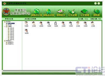 如圖所示的畫面即為網(wǎng)動(dòng)協(xié)同辦公系統(tǒng)的基礎(chǔ)工具——協(xié)同通訊系統(tǒng),該系統(tǒng)可將部隊(duì)機(jī)構(gòu)內(nèi)的所有部門、人員按照實(shí)際的組織結(jié)構(gòu)列出,應(yīng)用該系統(tǒng)的人員通過點(diǎn)擊其他在線人員,從而有選擇性的與對方進(jìn)行語音、視頻、數(shù)據(jù)共享、點(diǎn)對點(diǎn)會(huì)議等各種操作,將以往“看不見”的對話變?yōu)椤懊鎸γ妗钡慕涣。相比于傳統(tǒng)的電話溝通而言,它不僅更暢通快捷,更可以最大化的降低溝通成本。另外,數(shù)據(jù)共享功能還可以將軍隊(duì)里需共同探討的話題,如作戰(zhàn)地圖動(dòng)態(tài)研究、工作報(bào)告資料等實(shí)時(shí)顯示在數(shù)據(jù)區(qū)中,雙方通過電腦即可進(jìn)行遠(yuǎn)程的話題討論、圈點(diǎn)批注。