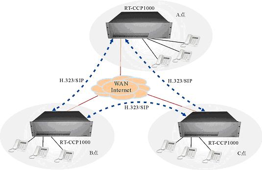 - 多個位于不同地點的RT-CCP1000通過廣域IP網(wǎng)互連,組成一個統(tǒng)一系統(tǒng),實現(xiàn)遠程無縫通信。