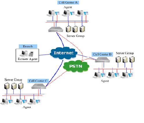 圖析:上圖中,整個分布式呼叫中心系統(tǒng)由三個獨立呼叫中心以及遠端座席構(gòu)成,彼此都通過Internet或者其它網(wǎng)絡(luò)互連。三個呼叫中心每個都是獨立完整的呼叫中心,在任何時候,都可以獨立工作,遠程座席則要注冊到某一呼叫中心上。