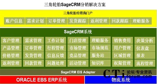 根據(jù)三角輪胎的業(yè)務需求,我們結合分銷行業(yè)的特點及以往經(jīng)驗,針對性提出了三角輪胎分銷CRM管理解決方案,與ERP系統(tǒng)、物流系統(tǒng)實現(xiàn)雙向無縫整合,為企業(yè)的戰(zhàn)略轉型提供了有力的信息技術支撐。