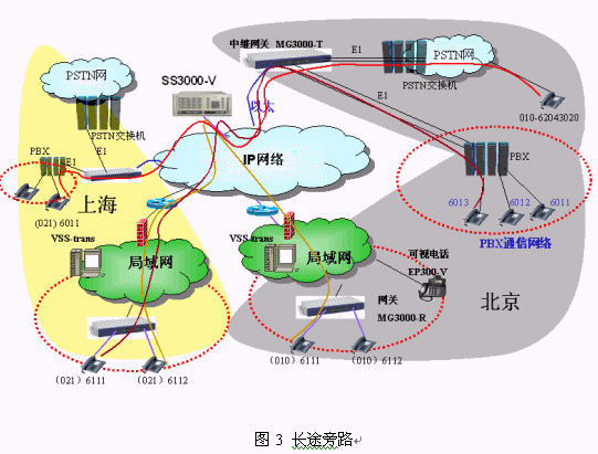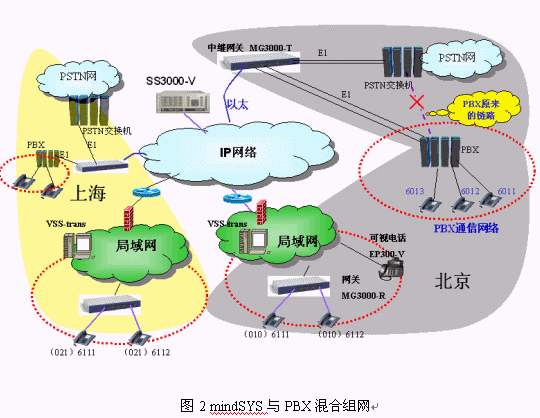 我們建設mindSYS系統(tǒng)的時候基本上不改變原來PBX的布線和配置,PBX原來的數字中繼直接連接到運營商的程控交換機,我們現在只是將PBX的數字中繼連接到中繼網關MG3000-T。PBX通信系統(tǒng)的電話完全沒有改變,還使用原來的電話號碼,打分機直接撥小號,打外線先撥0。mindSYS系統(tǒng)下的電話使用方式也完全一樣,對用戶來說就是一套系統(tǒng)。如北京的6011可以直接撥打6111,6111用戶也可以直接撥打6011,6111打外線先撥0,如062043020。北京的用戶呼叫異地用戶需要撥打完整號碼(大號),如北京的6011用戶撥0216111就可以接通上海的用戶,反之亦然。mindSYS系統(tǒng)的電話(圖2的所有電話)之間通話都免費。這樣我們的行業(yè)用戶可以既不改變原來的使用習慣,又能夠靈活的規(guī)劃各地的電話號碼來完成一個大型的跨地域的電話系統(tǒng)。