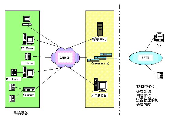 控制中心:包括資源管理系統(tǒng)、計費系統(tǒng)、網(wǎng)管系統(tǒng)、語音信箱。 其中,資源管理系統(tǒng)主要執(zhí)行地址翻譯、權限控制、路由管理等功能;計費系統(tǒng)主要完成計費及結算功能;網(wǎng)管系統(tǒng)完成對網(wǎng)絡及IP