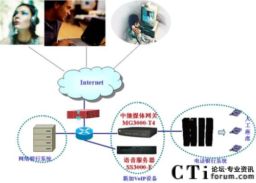 通過上述三環(huán)節(jié),Internet上的電話呼叫即可送入電話銀行的人工座席處,Internet上的客戶也就可以通過計算機上的耳麥和電話銀行座席人員通話。拓撲示意圖如下: