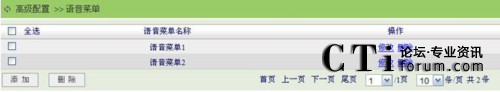 點擊“高級配置”菜單的“語音菜單”子菜單,進入語音菜單頁面,頁面默認顯示系統(tǒng)已經配置的所有語音菜單列表信息,在這里用戶可以創(chuàng)建新的語音菜單、修改刪除已有的語音菜單,如下圖所示: