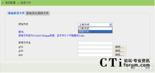 在定制語音菜單時,經常要提供聲音文件,目前系統(tǒng)支持G.723、G.729和gsm(針對G.711a和G.711u)類型的語音文件和音樂保持文件,單個文件大小不能超過512K。MG3000-X中的語音文件可以通過錄制或者上傳方式提供。