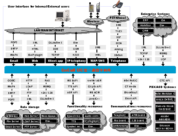 UC統(tǒng)一通信平臺是通信開發(fā)平臺的世界領(lǐng)先者, 提供功能強大而又迅速的開發(fā)技術(shù)來建立復(fù)雜的企業(yè)通信服務(wù)。這些技術(shù)包括CTI,傳真,數(shù)據(jù)通信,電子郵件,VXML, HTML,ASR,TTS, WAP,數(shù)據(jù)庫接入等。標(biāo)準(zhǔn)接口讓我們方便的與企業(yè)CRM、ERP、OA等系統(tǒng)連接。