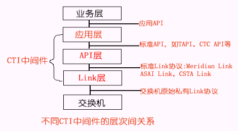根據(jù)CTI的功能定位,我們可以把CTI產(chǎn)品劃分為不同的層次,一般地可分為三種類型:Link層產(chǎn)品、API層產(chǎn)品、應用層產(chǎn)品,其分層結(jié)構(gòu)示意圖如下所示: