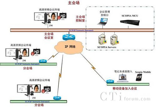 中心會場放置的SOCPIA Elite MCU是一款1080p的高清設(shè)備,其強(qiáng)大的處理能力和完備的冗余機(jī)制是整套系統(tǒng)的穩(wěn)定運(yùn)行的核心,可對各個(gè)會場的高清會議終端進(jìn)行統(tǒng)一編解碼管理。為了實(shí)現(xiàn)對新老終端設(shè)備的統(tǒng)一、簡單管理,用戶在總部機(jī)房部署了一套RADVISION的集中控制系統(tǒng)iView Suite,對全網(wǎng)的所有MCU及終端設(shè)備進(jìn)行集中管理和認(rèn)證。