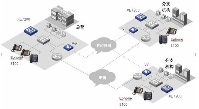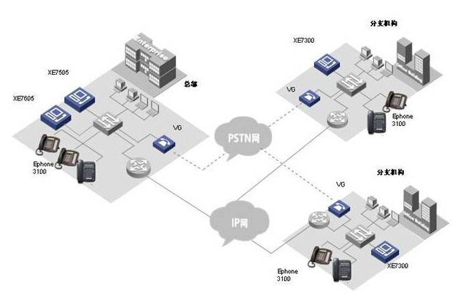 各小分支機構(gòu)的IP語音終端可以直接注冊到本地XE 7000上, 從而實現(xiàn)整網(wǎng)的分布式部署。