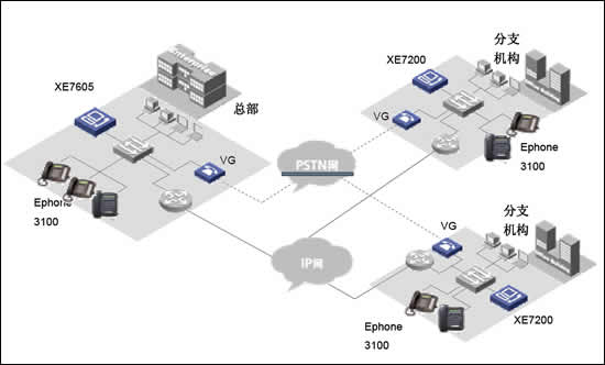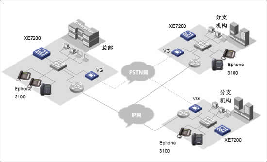 當(dāng)企業(yè)存在多個大型分部的時候,如一個國際性公司。則可以在各個分部部署XE7000冗余方案,每個分部維護(hù)獨(dú)立的本地用戶信息。各小分支機(jī)構(gòu)的IP語音終端可以直接注冊到本地XE7000上,從而實(shí)現(xiàn)整網(wǎng)的分布式部署。