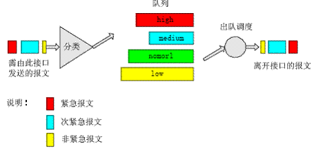 在報文到達路由設(shè)備接口后首先對報文進行分類,然后按照報文所屬的類別讓報文進入所屬隊列的尾部,在報文發(fā)送時按照優(yōu)先級總是在所有優(yōu)先級較高的隊列中的報文發(fā)送完畢后再發(fā)送低優(yōu)先級隊列中的報文,這樣在每次發(fā)送報文時總是將優(yōu)先級高的報文先發(fā)出去,保證了屬于較高優(yōu)先級隊列的報文有較低的時延與丟失率。