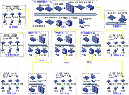 一般說來,城市監(jiān)控系統(tǒng)的網(wǎng)絡(luò)承載平臺(tái)要求建設(shè)專網(wǎng)或者VPN網(wǎng)絡(luò)。對(duì)于光纖資源較為豐富的城區(qū),可以使用數(shù)字SFP光纖接入,一個(gè)前端攝像頭對(duì)應(yīng)一條光纖;在光纖資源較少的區(qū)域,可以使用EPON(無源光網(wǎng)絡(luò))技術(shù),一芯光纖上可以同時(shí)接入多個(gè)前端攝像頭,大量節(jié)約了光纖資源和光纖租用成本;對(duì)于較為復(fù)雜的環(huán)境,不適合進(jìn)行布線,可以采用無線接入的方式,降低施工成本。