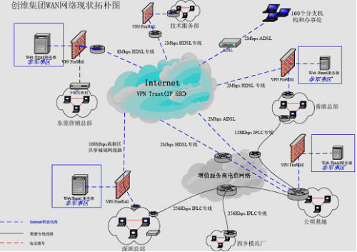 ·整個網(wǎng)絡連通性很差:隨著公司業(yè)務發(fā)展和規(guī)模擴大,現(xiàn)在整個集團除總部外還包括13個產(chǎn)業(yè)公司和全國160個分支機構(gòu),分布在以深圳為中心的全國各個地方,目前各產(chǎn)業(yè)公司之間的網(wǎng)絡連接除深圳總部、香港、公明基地和西鄉(xiāng)模具廠四地之間是通過窄帶IPLC專線連接外,其他各地均通過Internet公網(wǎng)連接,沒有構(gòu)成統(tǒng)一的企業(yè)內(nèi)部網(wǎng)絡互連。