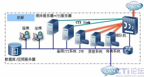 北京為總部中心,將部署CTI服務(wù)器、IVR服務(wù)器、錄音系統(tǒng)、傳真系統(tǒng)、文件服務(wù)器及相關(guān)業(yè)務(wù)數(shù)據(jù)庫服務(wù)器,為各個營業(yè)網(wǎng)點提供業(yè)務(wù)支撐?偛繉φ麄網(wǎng)絡(luò)進(jìn)行管理,包括平臺配置、業(yè)務(wù)管理、數(shù)據(jù)管理、人員調(diào)度等。在總部CTI系統(tǒng)我們采用主備模式,確保了在出現(xiàn)網(wǎng)絡(luò)故障主CTI系統(tǒng)無法提供服務(wù)情況下,備用CTI系統(tǒng)將接替主CTI系統(tǒng)工作,確保了整個系統(tǒng)的正常工作。硬件平臺方面,UAP我們采用了雙主控板雙電源供電工作模式,這對系統(tǒng)長期穩(wěn)定工作提供了保障。總部同時也部署北京農(nóng)村商業(yè)銀行300個坐席人員,這些坐席人員可以按照業(yè)務(wù)進(jìn)行區(qū)分,大部分坐席精通一般的業(yè)務(wù),為普通客戶提供優(yōu)質(zhì)服務(wù),少部分坐席(專業(yè)坐席)人員為高價值客戶提供高級的專業(yè)的優(yōu)質(zhì)服務(wù),在普通坐席比較忙時,專業(yè)坐席可以為普通用戶提供服務(wù),坐席中,還有極少部分可以充當(dāng)坐席管理員角色,他們也可以監(jiān)控各個分中心坐席服務(wù)的質(zhì)量,對有問題服務(wù)可以實現(xiàn)監(jiān)聽、監(jiān)察、和強(qiáng)拆功能,及時的保證服務(wù)質(zhì)量,維護(hù)了企業(yè)形象。