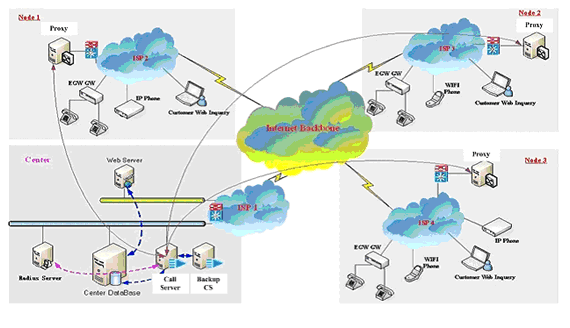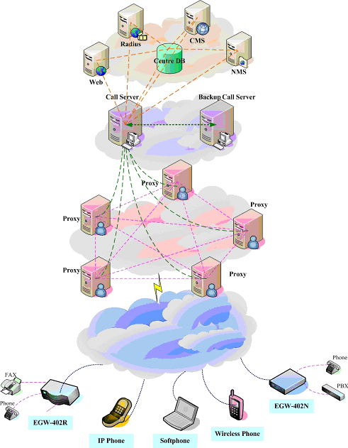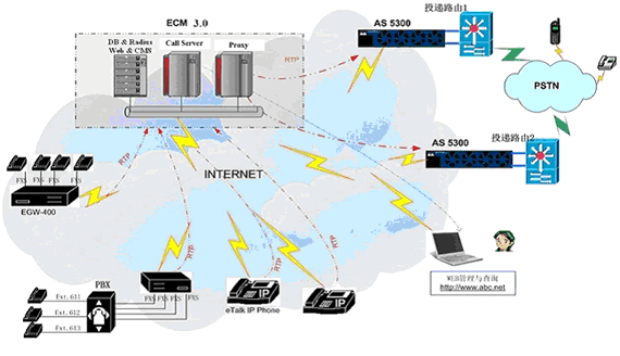 無論大型企業(yè)用戶(通過PBX接入網(wǎng)關(guān)設備)、小型企業(yè)用戶(使用網(wǎng)關(guān)設備)還是其它使用單口網(wǎng)關(guān)或IP Phone的用戶,都可以通過各種接入方式接入到ECM3.0網(wǎng)絡中,并通過PROXY及MEDIA