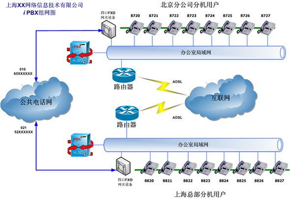 根據(jù)該用戶解決內(nèi)部通訊費用的要求,在北京和上海兩個iPBX系統(tǒng)之間實現(xiàn)互通。兩套iPBX的外線通過普通模擬網(wǎng)關的FXO口與現(xiàn)存的PSTN線連接。