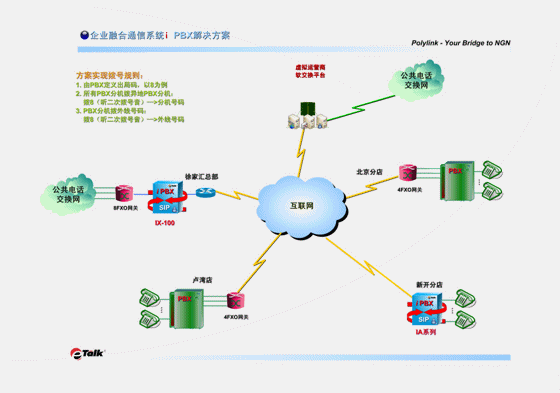 此方案實施后,用戶今后的VoIP分點(diǎn)擴(kuò)容會十分簡單易行。當(dāng)用戶有新的分店時,分店的通訊系統(tǒng)可以直接上一臺Polylink eTalk® IA系列i PBX,它既有與PBX相同而且更多的各種功能,還具有VOIP網(wǎng)關(guān)的功能,可直接與總部的IX系統(tǒng)互相注冊,既省掉了多添置一臺語音網(wǎng)關(guān)的成本,也避免了設(shè)備的重復(fù)堆壘。