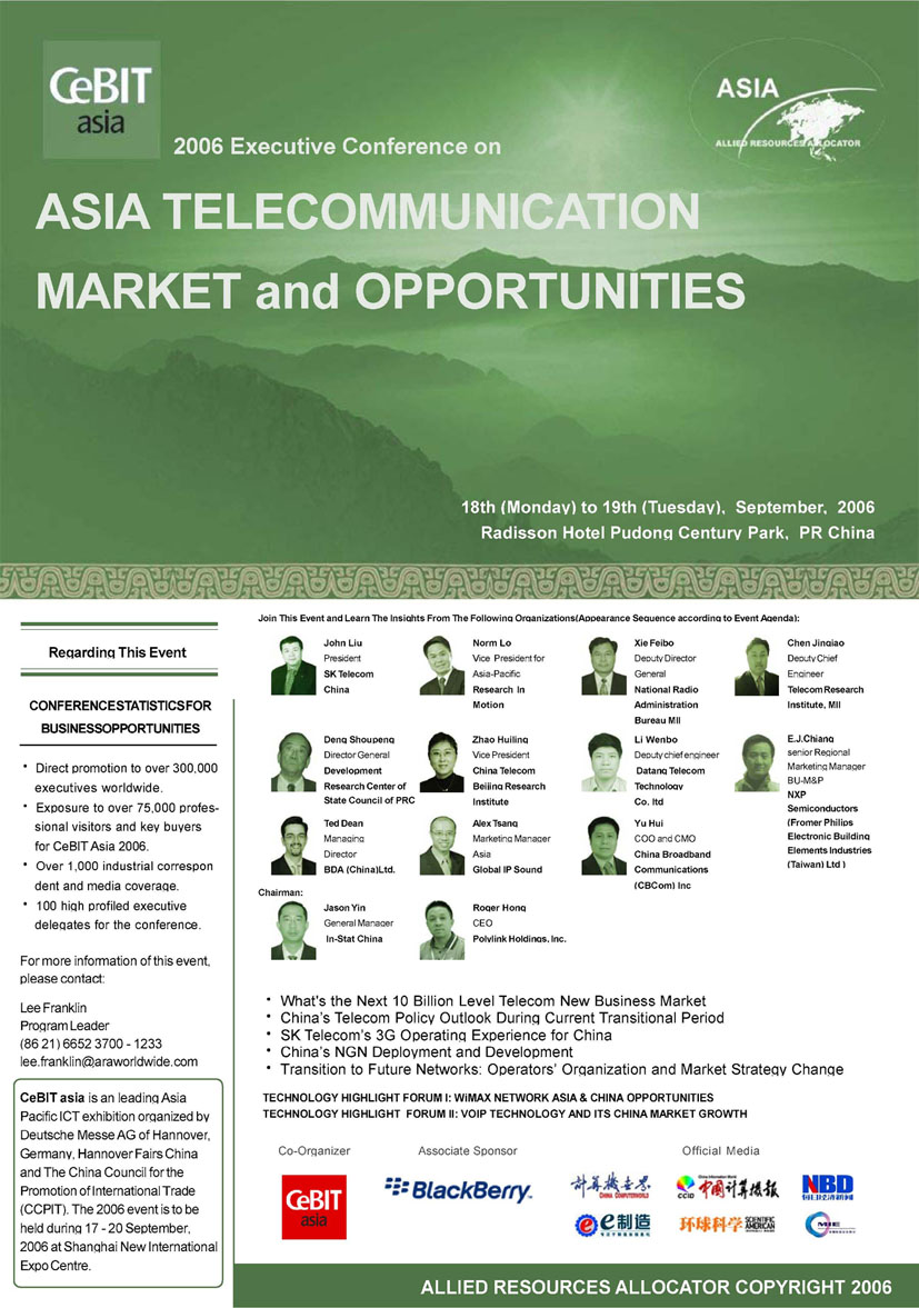 2006亞洲信息及通信技術(shù)展覽會,即亞洲CeBIT展將于今年9月17日至20日在上海新國際博覽中心召開。由中國國際貿(mào)促會電子信息行業(yè)分會與德國漢諾威展覽公司聯(lián)合主辦的這一展會,近300家國內(nèi)外廠商參展,將分為數(shù)字設(shè)備及系統(tǒng)、商務(wù)應(yīng)用、通信三大展區(qū),多方位展現(xiàn)ICT行業(yè)的最新趨勢,并成為業(yè)內(nèi)廠商的專業(yè)貿(mào)易平臺。本次CeBIT展會期間(9月18、19日兩天),將在浦東證大麗笙酒店召開“2006亞洲通信及信息市場管理層論壇”。包括中國國家信息產(chǎn)業(yè)部、中國電信、韓國SK電訊、BDA中國等多家政府機關(guān)、運營商、制造商將參加本次論壇,并做重要發(fā)言。