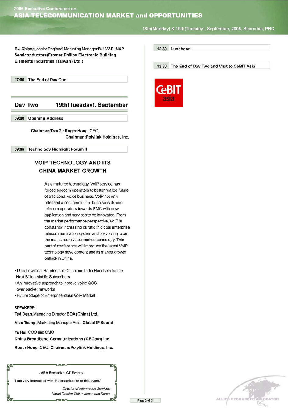 Polylink總裁應(yīng)邀擔任2006亞洲CeBIT“VoIP技術(shù)以及亞洲市場發(fā)展狀況”論壇主席
