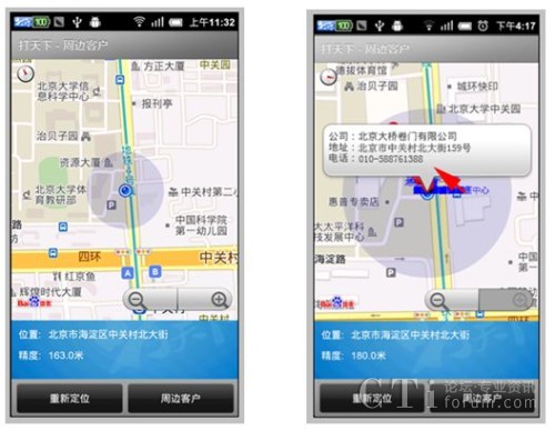 其二,打天下2.0新增了LBS的服務(wù)功能,原有的打天下只能實現(xiàn)拍照上傳、簽到等簡單功能應(yīng)用,而新版本則可以提供check的位置服務(wù),通過check可以在地圖上顯示標記地點周邊分布的客戶地理位置信息,極大方便了外勤員工的路線制訂。