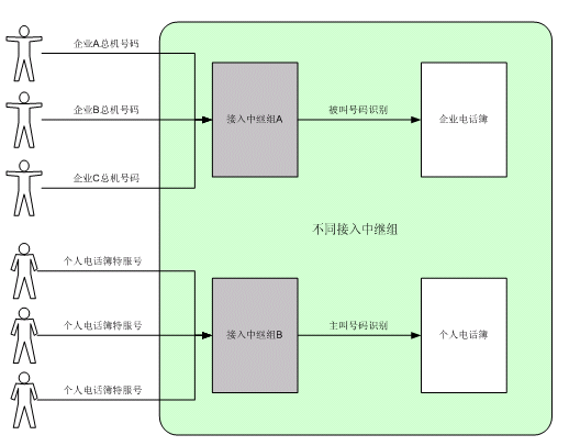 個人電話簿呼叫中,系統(tǒng)將根據(jù)主叫號碼,鑒別出主叫的身份,選擇進入相應(yīng)的個人電話簿,提供個人電話簿服務(wù)。