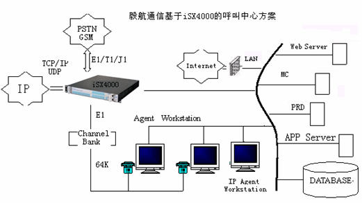 相對于現(xiàn)在的兩種主流呼叫中心方案,毅航通信基于iSX4000呼叫中心解決方案直接整合了Internet的接入。傳統(tǒng)由IVR完成的操作也可以通過Web頁面上的流程實現(xiàn),這樣用戶通過下拉菜單、簡單填寫、點擊按鈕等操作完成客戶識別、業(yè)務識別等操作,這些流程完成后,通過VoIP對呼叫中心呼入,由呼叫中心對呼入進行受理,再按照相應的原則分配到座席,座席再作相應的應答和處理,從而為客戶提供了一個通過Web站點直接進入呼叫中心的途徑,把Internet所具有的豐富信息資源和強大的功能賦予呼叫中心,它向客戶提供一個可訪問的Web站點,使得呼叫中心從“撥叫到交談(Dial to Talk)”發(fā)展到“點擊到交談(Click to Talk)”,通過Internet可以提供IP電話語音呼叫、Call Back、IP傳真、IM、E-mail等功能,擴展了通信渠道,一方面用戶可以實現(xiàn)免費接入到呼叫中心,另一方面企業(yè)能夠向更多的客戶提供優(yōu)質(zhì)、方便的服務資源,而且由于這些資源的價格相對傳統(tǒng)通信便宜,使企業(yè)為客戶提供全國、乃至于全球服務成為可能,提高了企業(yè)客戶服務水平,增強了企業(yè)競爭力。毅航通信統(tǒng)一呼叫中心解決方案系統(tǒng)結(jié)構(gòu)如圖所示: