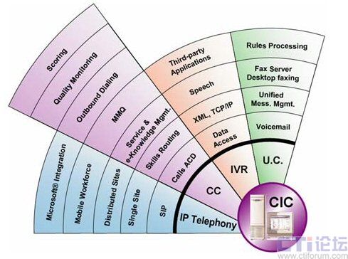 CIC平臺(tái)是一套符合呼叫中心營運(yùn)所需,且有其營運(yùn)所需模塊的All In One設(shè)備,如數(shù)字交換機(jī)、PABX、CTI、IVR、ACD、 Screen Pop、數(shù)據(jù)庫整合、網(wǎng)站整合服務(wù)(Web Call Back、Web Chat、VON、E-mail)、傳真服務(wù)器、傳真自動(dòng)回復(fù)、Dialer、Scripter、在線錄音...等所有功能,采用CIC平臺(tái)的系統(tǒng)比基于傳統(tǒng)PBX的系統(tǒng)更加易于維護(hù)。 CIC為企業(yè)體帶來一個(gè)功能齊備,技術(shù)人員及值機(jī)人員可以自己完全掌握的Call Center系統(tǒng),并且也是一個(gè)最上算投資報(bào)酬率ROI(Return Of Investment)的解決方案。