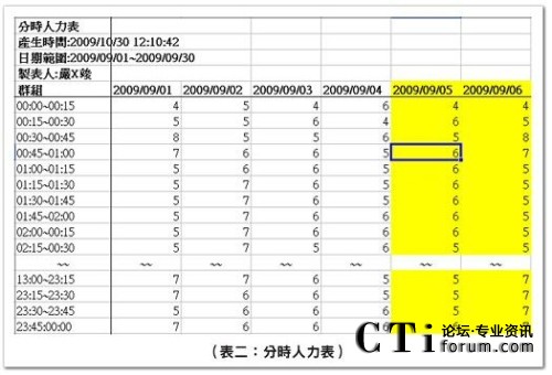 分時(shí)人力表在管理上有重要的地位,用于檢視時(shí)間內(nèi)排定的出席人數(shù),通常是將此數(shù)據(jù)與預(yù)測(cè)的話務(wù)需求做比對(duì),檢查排定人力數(shù)與話務(wù)曲線的擬合度。在現(xiàn)場(chǎng)管理時(shí),則用于小休調(diào)度,避免小休人數(shù)過(guò)多,使出席人數(shù)降到關(guān)鍵少數(shù)的臨界點(diǎn)下,造成服務(wù)水平大幅跌落的狀況發(fā)生。