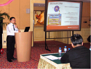 微軟公司負(fù)責(zé)天津地區(qū)的夏玉玲小姐在簡(jiǎn)短的開(kāi)幕式后首先發(fā)表演講,介紹了微軟為商業(yè)應(yīng)用開(kāi)發(fā)的各種商務(wù)解決方案(MBS)。其后通用咨詢公司總經(jīng)理鄭明先生上臺(tái)演說(shuō),其演講主題將營(yíng)銷(xiāo)管理理論體系與微軟CRM密切結(jié)合,博得了與會(huì)者贊同的掌聲。