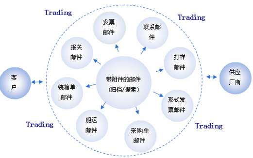 郵件是貿(mào)易中不可缺少的技術(shù)工具,郵件系統(tǒng)提供郵件的收發(fā)和管理,但是它并沒有提供和線索、活動(dòng)、客戶、供應(yīng)商、訂單集成的功能。Trading