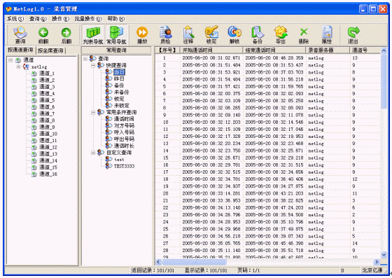 主要是對錄音進(jìn)行管理,分為錄音查詢和錄音操作兩大部分。錄音查詢除了提供常規(guī)的按條件組合查詢外,還提供了人性化的常用查詢,系統(tǒng)已經(jīng)內(nèi)置了很多常用查詢,例如:當(dāng)日查詢,您只要直接選擇當(dāng)日查詢,就可以馬上開始查詢當(dāng)日的所有錄音,減少您每次輸入查詢條件的工作量,并且還可以靈活的自定義常用查詢,充分滿足您的查詢要求。錄音操作提供了方便快捷的操作方式。批量數(shù)據(jù)的處理能力可以讓用戶以最快的速度從煩瑣的工作中解脫出來。詳細(xì)的記錄信息可以滿足所有用戶的要求,特定信息的加入可以滿足特殊行業(yè)的使用,如呼叫中心行業(yè)、服務(wù)臺、傳呼臺等。