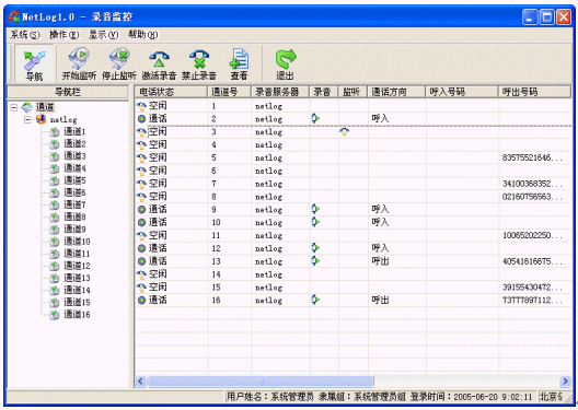 Netlog系統(tǒng)中控制臺是一個統(tǒng)一配置和管理的平臺,可以部署在網(wǎng)絡(luò)內(nèi)的任意一臺主機(jī)上,各個功能模塊都可以單獨工作,也可以同時使用,控制臺所有模塊可以通過系統(tǒng)導(dǎo)航(ToolBar)來引導(dǎo)啟動。用戶可以通過控制臺操作網(wǎng)絡(luò)上所有記錄服務(wù)、數(shù)據(jù)服務(wù)和文件服務(wù)?刂婆_作為最終用戶終端可以完成用戶的所有操作,設(shè)置每個服務(wù)器甚至每個通道的屬性、執(zhí)行各種用戶操作、指定服務(wù)的工作方式、錄音查詢、錄音管理、輸出報表、排班等?刂婆_根據(jù)用戶權(quán)限的不同限定用戶的操作,更好的保障了系統(tǒng)的運(yùn)行和語音記錄文件的安全。