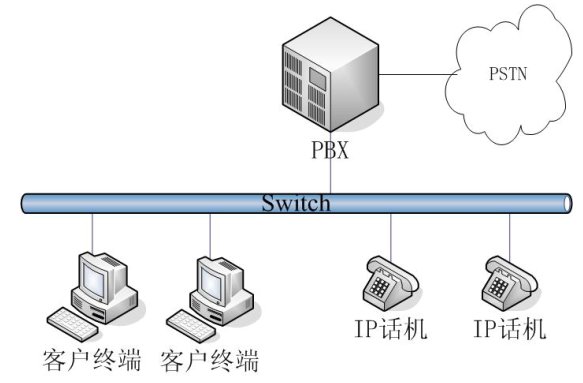 - 簡單網(wǎng)絡(luò)結(jié)構(gòu):一般適用于小型企業(yè)或企業(yè)內(nèi)某個部門的網(wǎng)絡(luò)結(jié)構(gòu)。內(nèi)部通訊在一個網(wǎng)段內(nèi),外部通訊通過一臺PBX交換。