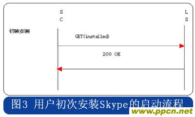 Skype的用戶終端啟動(dòng)時(shí),采用HTTP協(xié)議連接到注冊(cè)服務(wù)器,用戶初次安裝的啟動(dòng)流程中攜帶“installed”的參數(shù),使用時(shí)啟動(dòng)流程則在消息中攜帶“getlatestversion”參數(shù),具體流程分別見圖3和圖4。
