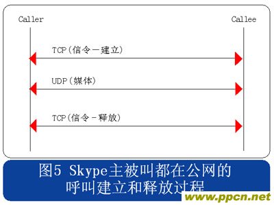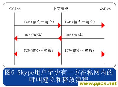 從上述流程圖可見,Skype的呼叫信令都采用TCP封裝,而媒體流則使用UDP封裝,當(dāng)有任何一方用戶位于限制UDP包的防火墻內(nèi)時(shí),媒體流就會(huì)采用TCP封裝。另外當(dāng)Skype用戶至少有一方位于私網(wǎng)內(nèi)時(shí),所有的信令和媒體消息都經(jīng)過一個(gè)或多個(gè)中間節(jié)點(diǎn)轉(zhuǎn)發(fā)。此時(shí)無需擔(dān)心用戶通話的媒體流因?yàn)榻?jīng)過中間節(jié)點(diǎn)轉(zhuǎn)發(fā)而被竊聽,因?yàn)镾kype采用了對(duì)消息進(jìn)行端到端加密的機(jī)制。