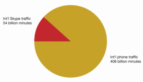 數(shù)據(jù)顯示,2009年全球國際長途電話通話時長為4060億分鐘,其中Skype至Skype的通話時長為540億分鐘。TeleGeography表示,過去25年,通過電話機的國際長途電話通話量年增長率為15%,但過去幾年中這一增長率有所下降。過去兩年,這類國際長途電話通話量每年增長率僅為8%。