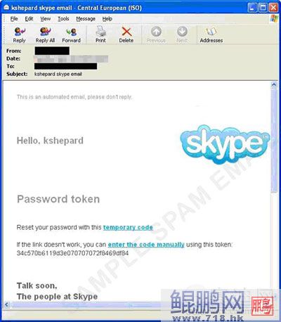 不幸的是,Skype的弱點漏洞在過去也曾被發(fā)現(xiàn)利用,Skype的知名度也同樣地被利用來進行垃圾訊息攻擊。下圖所示是目標針對Skypeg使用者的垃圾訊息: