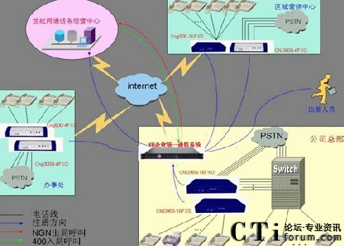 總部現(xiàn)在使用的為傳統(tǒng)PBX設(shè)備,配置為50路外線和200內(nèi)線,分機(jī)為8前綴4位的分機(jī)號(hào)碼,如8001分機(jī)。32個(gè)的辦事處使用電信匯線通或直接的PSTN線路,2個(gè)的區(qū)域營(yíng)銷中心使用匯線通或直接的PSTN線路,2個(gè)分公司使用的小型PBX?偛磕壳吧暾(qǐng)了4條2M的ADSL線路做為一個(gè)集合,沒有固定的IP地址,各個(gè)分公司也多使用ADSL上網(wǎng)或電信的小區(qū)寬帶上網(wǎng)。