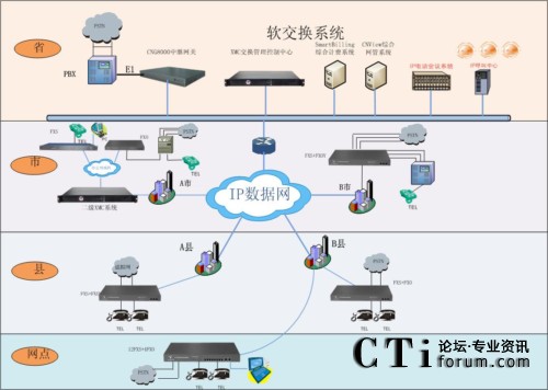 - 地州市分集團放置的二級軟交換系統(tǒng),作為其管轄的縣(市)級分集團和營業(yè)廳的呼叫控制中心,管理和控制其管轄地區(qū)的IP電話終端設備。